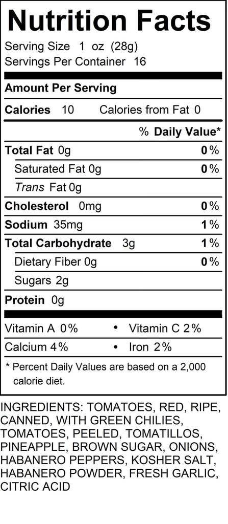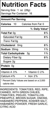INGREDIENTS: TOMATOES, RED, RIPE, CANNED, WITH GREEN CHILIES, TOMATOES, PEELED, TOMATILLOS, PINEAPPLE, BROWN SUGAR, ONIONS, HABANERO PEPPERS, KOSHER SALT, HABANERO POWDER, FRESH GARLIC, CITRIC ACID
